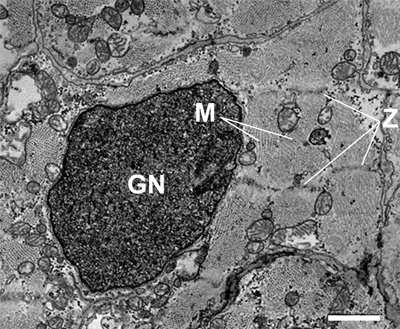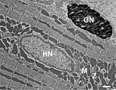 此外,當(dāng)用電子顯微鏡觀察時(shí),可以清楚地區(qū)分移植的心肌細(xì)胞和宿主心肌細(xì)胞。盡管一些未成熟的與宿主的心肌細(xì)胞,移植的心肌細(xì)胞?帶相比和M帶相對(duì)成熟的肌節(jié)這樣被接納為結(jié)構(gòu)(圖2)。