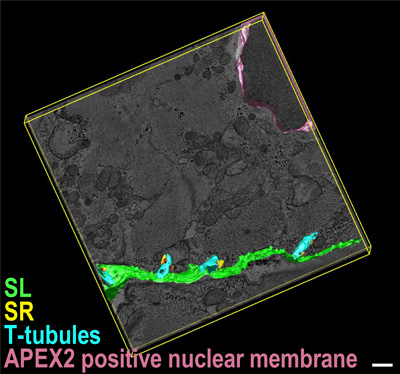 (左)APEX 2被證明是移植的心肌細(xì)胞(粉紅色),并且T-管(淺藍(lán)色)開(kāi)始在移植的心肌細(xì)胞中形成。(比例尺:500 nm)