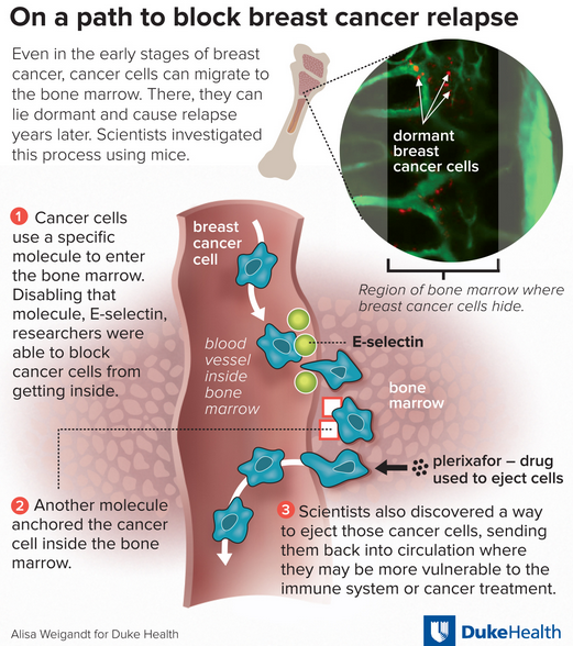 杜克癌癥研究所的科學(xué)家們乳腺癌細(xì)胞用于入侵小鼠骨髓的分子鑰匙,入侵到骨髓后癌細(xì)胞就可以避免被化學(xué)治療方法或激素治療方法清除。