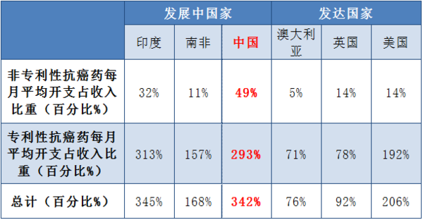 盡管在同種藥物 價格上發(fā)展中國家較發(fā)達國家便宜,由于普遍收入水平較低,以藥物價格除以人均GDP后(每月人均收入)得出抗癌藥物相對價格后發(fā)現(xiàn),發(fā)展中國家藥物相對價格較發(fā)達國家高,其占比可高達每月收入的342%(中國)和345%(印度)。也就是說在例如中國或者印度這樣的發(fā)展中國家,若罹患癌癥,人民每月平均需要花上收入的3倍多用于購買抗癌藥物。