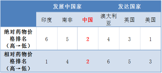 表2各國非專利藥和專利藥的相對價格對比(占居民月收入百分比%)