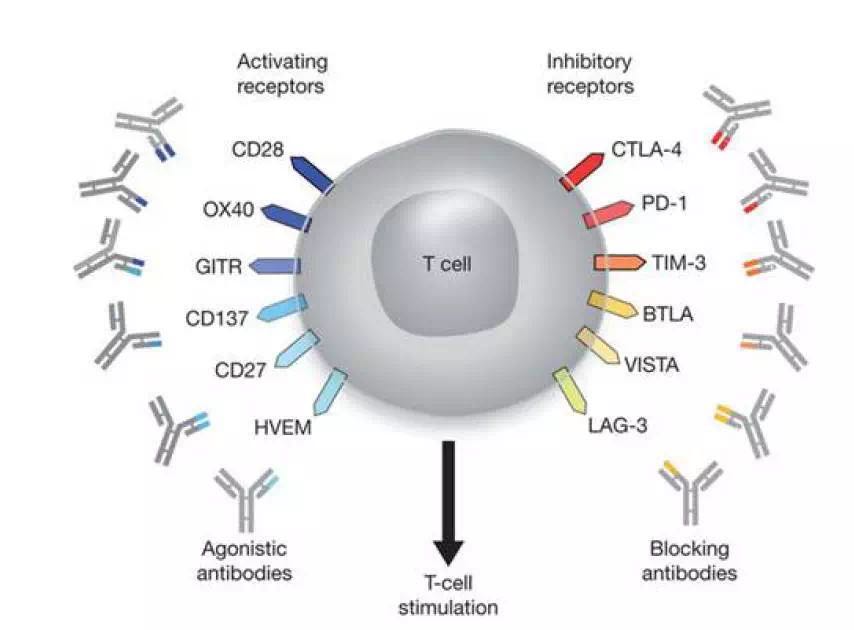圖1.T細(xì)胞表面的主要刺激性和抑制性受體