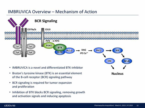 IMBRUVICA是一種口服型每日一次的治療手段,可抑制一類被稱為Bruton的酪氨酸激酶(BTK)蛋白質(zhì)。BTK是B細(xì)胞受體信號(hào)轉(zhuǎn)導(dǎo)復(fù)合物中的關(guān)鍵信號(hào)分子,在惡性B細(xì)胞的存活和擴(kuò)散中起重要作用。IMBRUVICA可有效阻斷惡性B細(xì)胞不可控繁殖和擴(kuò)散的細(xì)胞信號(hào),幫助殺死并降低癌細(xì)胞數(shù)量,延緩癌癥的惡化。