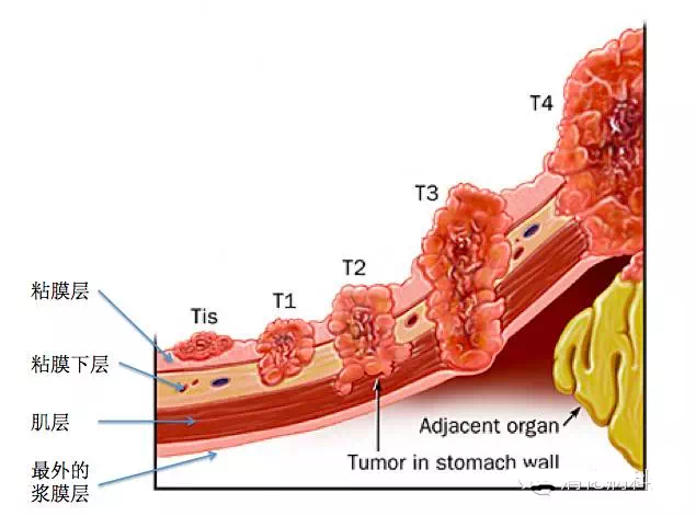 如下圖所示,胃癌是從胃的粘膜層發(fā)展而來,隨著腫瘤生長,會浸潤粘膜下層、肌層、突破漿膜層以及發(fā)生淋巴結(jié)轉(zhuǎn)移和遠(yuǎn)處轉(zhuǎn)移。