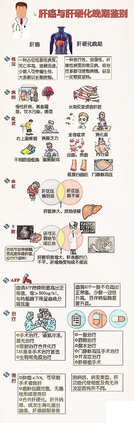 如何在肝硬化晚期,肝臟發(fā)生癌變?cè)缙诩皶r(shí)發(fā)現(xiàn)?如何準(zhǔn)確辨別肝硬化及肝癌?這張圖興許能直觀的幫助鑒別。