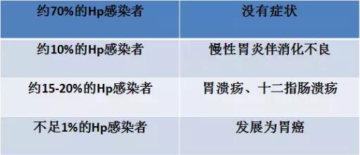 Hp在我國成人的感染率很高,達(dá)到40-60%。但是,約70%的Hp感染者其實(shí)終身沒有任何癥狀,大約10%感染者患慢性胃炎伴消化不良,15-20%感染者患胃潰瘍、十二指腸潰瘍,只有不足1%的Hp感染者較終會(huì)發(fā)展為胃癌。中國新發(fā)胃癌病例數(shù)多,Hp感染人口的基數(shù)大是其原因之一。