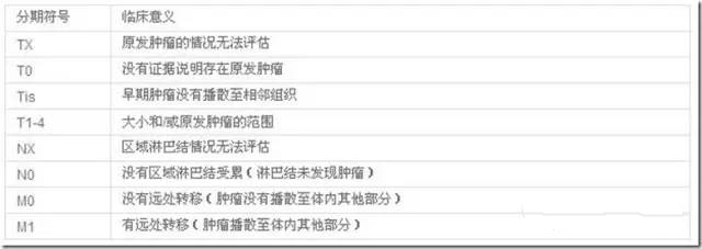 T、N、M每個(gè)指標(biāo)還有具體細(xì)分。以T為例,Tx表明原發(fā)腫瘤無(wú)法評(píng)估,T0意為無(wú)原發(fā)腫瘤的證據(jù),Tis說(shuō)明是原位癌。T1,T2,T3和T4表示原發(fā)腫瘤逐級(jí)增大。N與M也可以進(jìn)行類似的分級(jí),用以標(biāo)注淋巴結(jié)及遠(yuǎn)處的轉(zhuǎn)移情況。較終,根據(jù)T/N/M的情況可以綜合判斷出患者的分期(即第I期至第IV期)狀況。