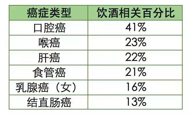 飲酒和常見的乳腺癌,結直腸癌,肝癌,食管癌,胃癌和胰腺癌等都有直接關系。當然,和酒精關系較密切的癌癥類型,來自喝酒會直接接觸的組織:口腔癌,喉癌,食管癌等。來自美國的前沿數據顯示,41%口腔癌,21%食管癌都和飲酒有關。