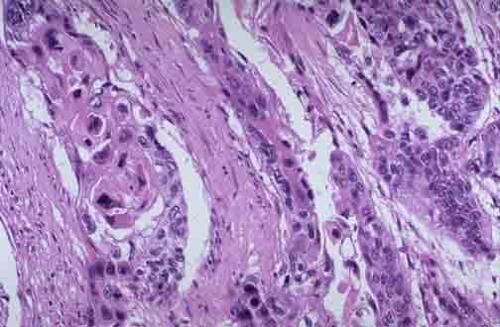 ? ? ? 鱗狀細(xì)胞癌亦稱(chēng)皮樣癌,主要從有鱗狀上皮覆蓋的皮膚開(kāi)始。皮膚和結(jié)膜交界處的瞼緣是其多發(fā)部位。此類(lèi)癌腫惡性程度較基底細(xì)胞癌者為高。發(fā)展較快,破壞也較大。即可破壞眼部組織,侵入副鼻竇或顱內(nèi),又可以通過(guò)淋巴管轉(zhuǎn)移至耳前或頜下淋巴結(jié),甚至引起全身性轉(zhuǎn)移。