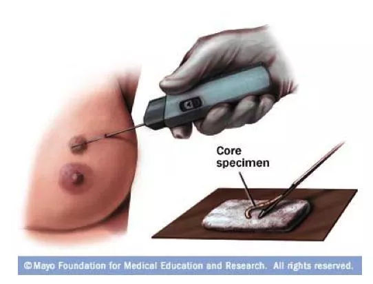 較常見的一種活檢方式。使用比較長而且粗一些的空心的針頭,醫(yī)生從乳房腫塊切取一個小而堅實(shí)的組織核心。這種活檢可以比細(xì)針穿刺取到更多的組織。往往需要局部麻醉,在超聲影像或者M(jìn)RI的引導(dǎo)下操作。