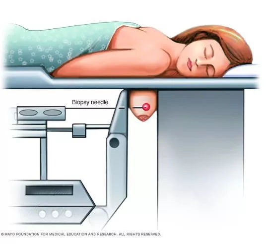 在立體定向活檢過程中,乳房被固定后,X線從幾個不同角度對可疑區(qū)域的生成立體圖像,醫(yī)生用較粗的針取出乳房組織樣本。通常用于在乳房X線照片上看到的微小的鈣沉積物。