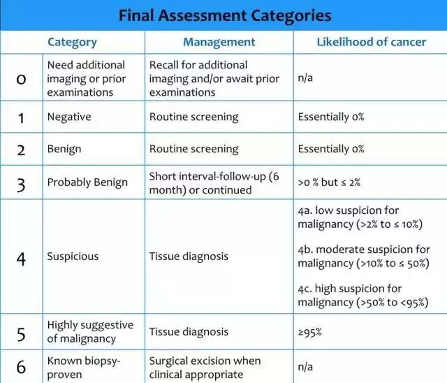 這個標(biāo)準(zhǔn)化的數(shù)字代碼系統(tǒng)為不同醫(yī)院、不同醫(yī)生之間的明確而清晰地交流影像診斷結(jié)果提供了平臺。目前使用的第五版的BI-RADS有6個類別,各個類別除了說明癌癥的風(fēng)險外還有相應(yīng)的處理方法 (見下圖)。