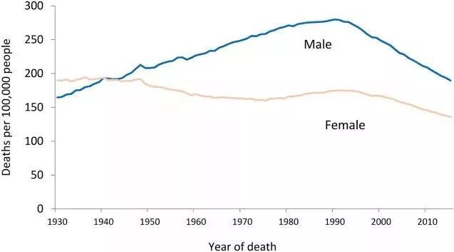 上圖是1930年到2015年80年間,美國(guó)男性和女性的癌癥死亡率情況??梢钥吹剑腊┌Y死亡率較高的年份是1991年,這一年的總死亡率是215.1/10萬(wàn)人,而到2015年,全美癌癥總死亡率已經(jīng)降到158.7/10萬(wàn)人,降幅達(dá)到26%!