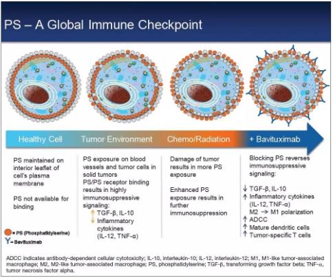 ▲細胞表面的PS是一個免疫檢查點(圖片來源:http://www.personalizedmedonc.com/article/bavituximab-a-novel-investigational-immunotherapy-agent-targeting-phosphatidylserine-in-the-vasculature-of-the-tumor-microenvironment/)