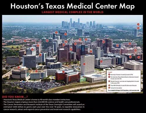 德州醫(yī)療中心是一個完完全全的醫(yī)學(xué)城,除了一部分停車場外,幾乎所有的建筑都是醫(yī)療機構(gòu)。該中心擁有21家世界知名的綜合醫(yī)院和值得信賴的??漆t(yī)院、13家支持醫(yī)療機構(gòu)、8家聞名醫(yī)療科研機構(gòu)、6家護理機構(gòu)、3家公共健康組織、3座醫(yī)學(xué)院、兩所大學(xué)、兩家藥學(xué)院,和一家牙科學(xué)院。整個醫(yī)療中心現(xiàn)有十幾萬雇員。