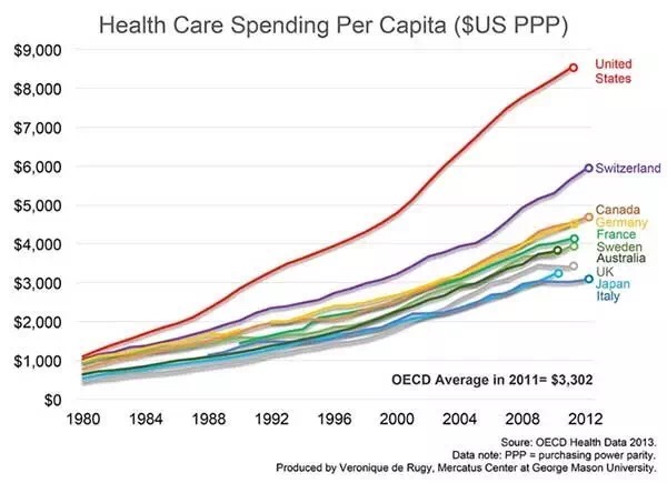 可是,要真的有上面吹得這么好,還改什么革?在美麗的光環(huán)背后,美國醫(yī)療有一個致命缺點:花費太高。美國每年花在醫(yī)療上的總開支超過三萬億美元,平均每人每年近一萬美元,是其它發(fā)達國家的人均花費的兩倍多。相比之下,中國每年每人醫(yī)療花費不到五百美元(中國醫(yī)生收入低也就不足為奇了)。