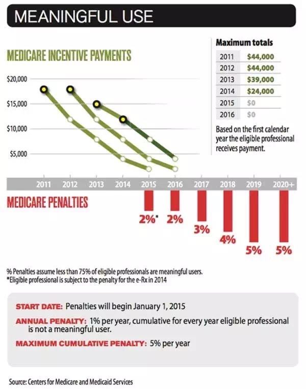 有了以上的背景,我們就可以理解政府推廣電子病歷的模式了。胡蘿卜是每一個采用電子病歷的醫(yī)生可得四萬四千美元。大棒則是……對不采用符合規(guī)定的電子病歷的醫(yī)生醫(yī)院,享受政府醫(yī)保的病人將會得到比其他醫(yī)生低的付款。