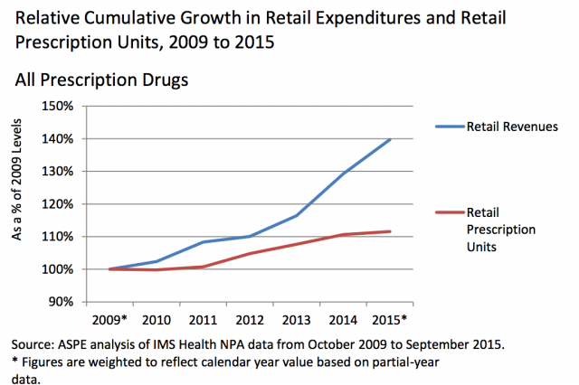 這一問題的嚴重性并不是一兩個新聞頭條就能概括的。美國衛(wèi)生與公共服務部(Department of Health and Human Services)的數(shù)據(jù)顯示,2015年美國人總體處方藥花費高達4570億美元,比2009年上漲了近1000億美元。