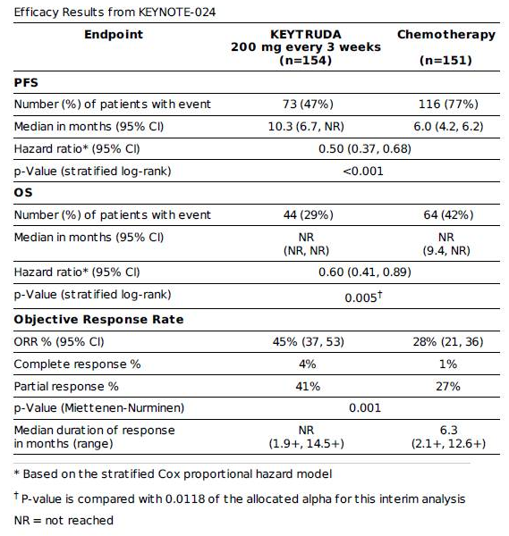 本次FDA批準(zhǔn)KEYTRUDA上市是基于KEYNOTE-024的專業(yè)臨床試驗(yàn)數(shù)據(jù)。在這項(xiàng)隨機(jī)、公開標(biāo)注的3期臨床試驗(yàn)中,研究人員檢驗(yàn)了KEYTRUDA作為單一治療方法治療非小細(xì)胞肺癌初治患者的效果,這些患者的PD-L1表達(dá)量都超過了50%。與標(biāo)準(zhǔn)的含鉑化療相比,使用KEYTRUDA的患者其無進(jìn)展生存期(HR,0.50[95% CI,0.37,0.68];p<0.001)與總體生存率(HR,0.60[95% CI,0.41,0.89];p=0.005)都得到了顯著的改善,分別抵達(dá)了主要與次要臨床終點(diǎn)。因此,這項(xiàng)試驗(yàn)也在今年6月提前終止,讓化療組的患者能夠前列時(shí)間接受KEYTRUDA的治療。