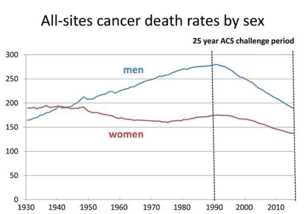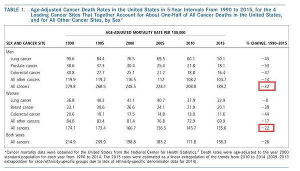 如今25年過去了,分析美國總體癌癥相關(guān)數(shù)據(jù),1990~2015年間,美國癌癥死亡率總體降低26%,其中男性降低32%,女性降低22%。