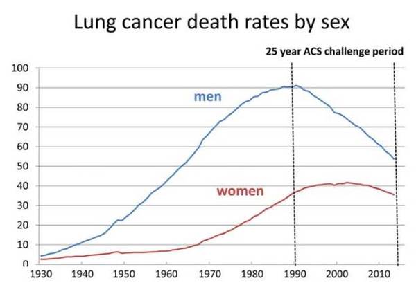 1990~2015年,美國男性肺癌患者死亡率降低45%、女性肺癌死亡率僅降低8%。
