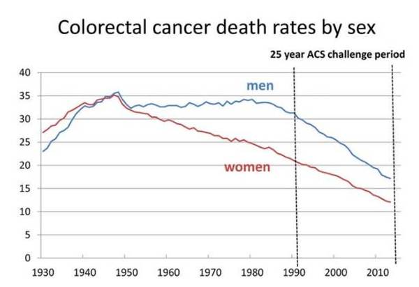 1990~2015年,美國男性結(jié)直腸癌死亡率降低47%、女性降低44%。