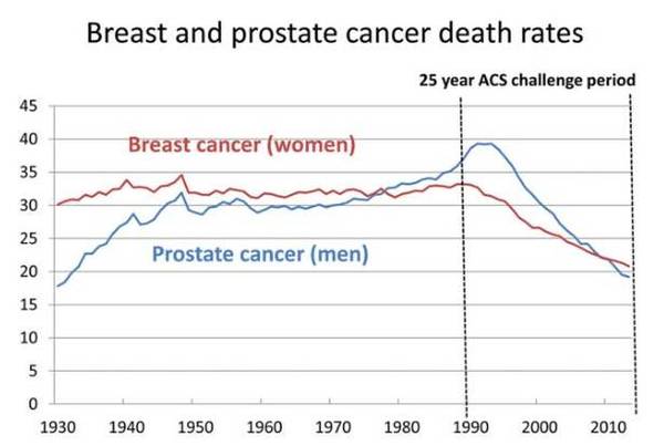前列腺癌是死亡率降低專門達到預(yù)期目標(biāo)的癌癥,其下降率雖然與PSA篩查早期前列腺癌升高率呈正相關(guān),但是否有直接關(guān)系并不明確。常識顯示PSA能夠早期確診無癥狀前列腺癌,但個別機構(gòu)并不支持死亡率的降低與PSA檢查有關(guān)。他們認(rèn)為根治性前列腺切除術(shù),及區(qū)域選擇性放療(前列腺高劑量放射,周圍組織低劑量放射)才是降低死亡率的有效措施。