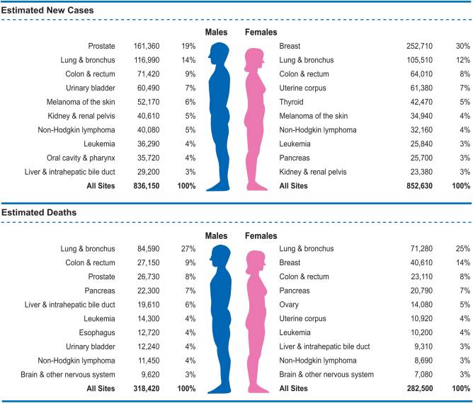 如果將對性別區(qū)分來看,前列腺癌、肺癌與結(jié)直腸癌預(yù)計將在2017年占所有新診斷癌癥的42%,其中前列腺癌將占約20%。對女性而言,2017年較為常見的三種癌癥將是乳腺癌、肺癌與結(jié)直腸癌。它們將占全部癌癥的近一半。對女性來說,乳腺癌將占新病例的30%。