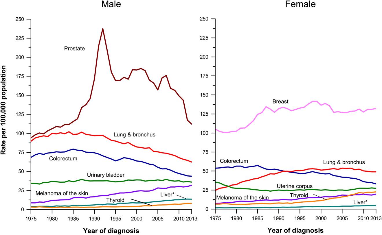 ▲男性與女性不同癌癥發(fā)病率的變化(圖片來源:2017癌癥統(tǒng)計)