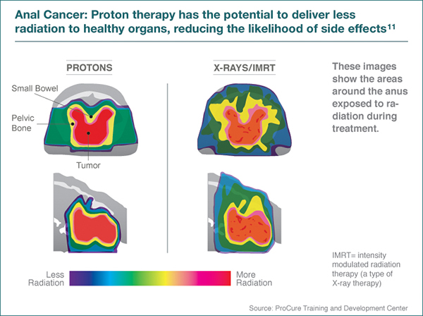 質(zhì)子治療方法是一種輻射治療方法,其靶向腫瘤中的質(zhì)子以殺死癌細胞。與傳統(tǒng)的X射線放射治療相比,它具有更高,更有效的輻射劑量,具有極高的精度,顯著限制了肛門周圍健康組織(如生殖器,皮膚,腸,膀胱和骨髓)的輻射照射。這可能減少治療的副作用,并允許較短的治療過程 - 有時比星期更短 - 與X線放射治療相比。