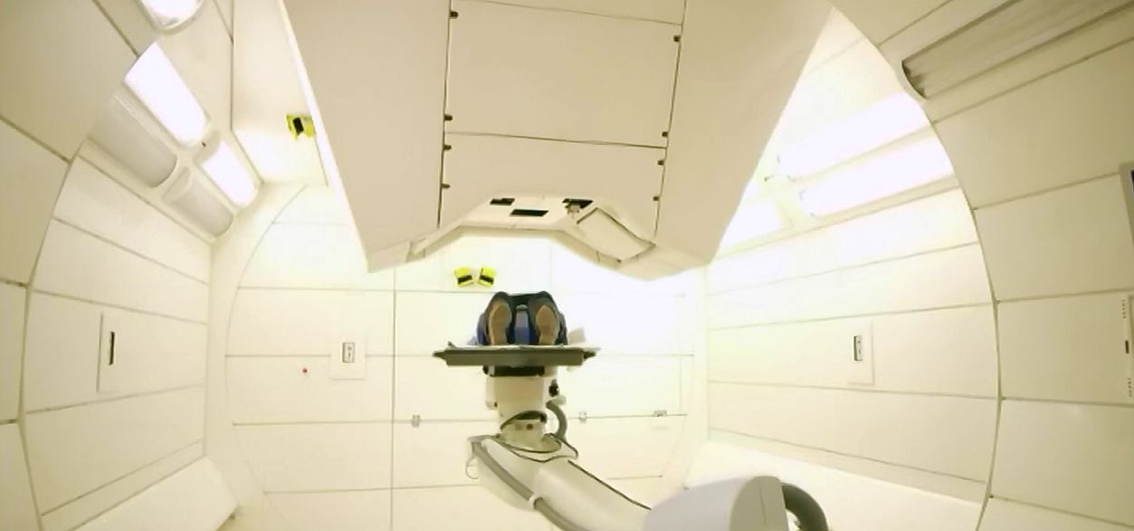 該中心質(zhì)子設(shè)備使質(zhì)子束可在人體內(nèi)達(dá)到25厘米的深度。質(zhì)子束是由重達(dá)220噸的回旋加速器裝置來(lái)生成高能量的質(zhì)子束,再用電磁鐵引導(dǎo),通過(guò)治療室背面的龍門發(fā)射架改變照射方向,把質(zhì)子束照射到患者身上。龍門架是一個(gè)巨大的裝置,配有電磁鐵,通過(guò)旋轉(zhuǎn)它可以360度地在病人周圍的任何地方進(jìn)行照射。