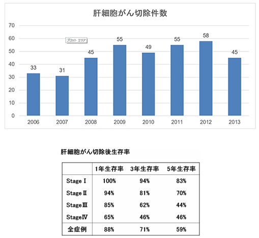 下圖為癌研有明醫(yī)院肝細(xì)胞癌切除數(shù)及術(shù)后生存率