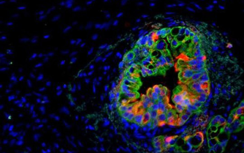 這個圖像顯示了干細(xì)胞基因Musashi在人胰腺癌中的表達(dá)。癌細(xì)胞顯示綠色,Musashi的表達(dá)顯示紅色,藍(lán)色表示在癌細(xì)胞微環(huán)境中的細(xì)胞。