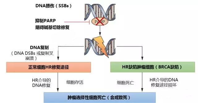 圖1:PARP抑制劑對(duì)BRCA1/2缺陷性細(xì)胞的選擇性合成致死作用