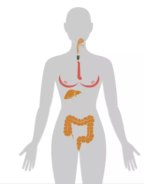 酒精致癌,那是全面開花,如圖,從上到下哪哪都有。口咽、喉部、食道、乳腺、肝臟、結(jié)腸還有直腸,它都不放過(guò)。