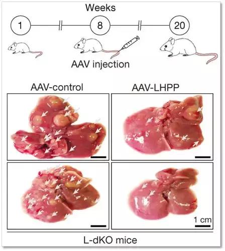 研究者們繼續(xù)做小鼠實(shí)驗(yàn),將小鼠的LHPP基因裝載到腺相關(guān)病毒(AAV病毒)載體(用于表達(dá)LHPP基因)之后,包裝病毒用于注射治療上述的雙敲除小鼠模型的肝癌,結(jié)果竟然驚人地發(fā)現(xiàn),這些基因敲除小鼠原本布滿(mǎn)腫瘤的肝臟竟然奇跡般地恢復(fù)了正常肝臟的模樣,絕大部分腫瘤消失了,這不得不說(shuō)是一個(gè)重要的發(fā)現(xiàn)。