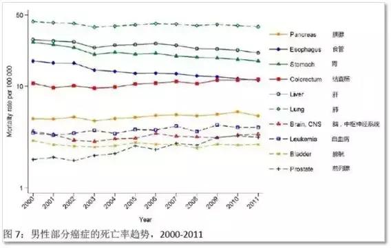 ▲我國(guó)男性各種不同癌癥的死亡率趨勢(shì)(Cancer statistics in China, 2015)