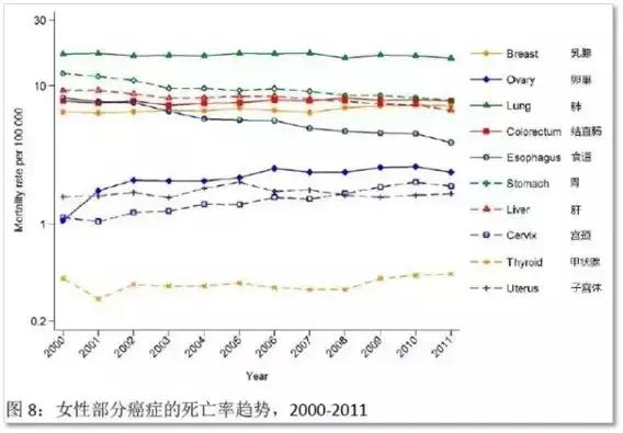 ▲我國(guó)女性各種不同癌癥的死亡率趨勢(shì)(Cancer statistics in China, 2015)