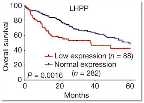 ▲LHPP表達(dá)量與肝癌患者生存率分析,LHPP表達(dá)量越高,生存率越高(圖片來(lái)自Nature)