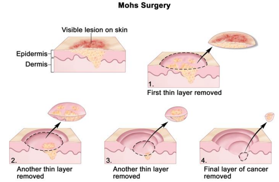 莫氏手術(shù)。一種外科手術(shù),以幾個步驟去除皮膚上的可見損傷。首先,去除一層薄薄的癌組織。然后,在顯微鏡下移除第二薄層組織并觀察以檢查癌細(xì)胞。一次去除多個層,直到在顯微鏡下觀察到的組織顯示沒有剩余的癌癥。這種類型的手術(shù)是用來盡可能少的正常組織去除。